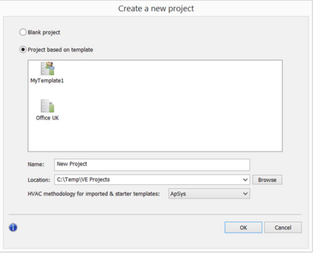 It may be desirable to start a new project with pre-populated data (templates; scheduling profiles; constructions; HVAC systems; etc.). This can be done using the New Project Wizard (version 2014.FP1 onwards).