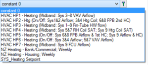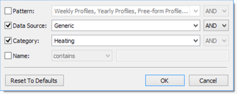 As you can see from the example image on the left, with no filtering the drop-list would contain a large number of profiles (note the scrollbar), many of which are intended for functions other than heating. It also includes a large number of Title24 profiles, which may not be relevant. In contrast, the image on the right shows the drop-list with the filtering options applied – only Generic data-source profiles are displayed (excluding the large amount of Title24 profiles) and of those, only the profiles marked with the Heating category.
