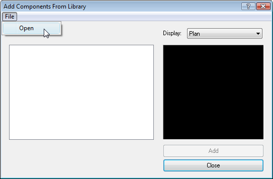 By clicking the “File” button the user can browse to find an existing component library. Components can be selected and added to the current component library.