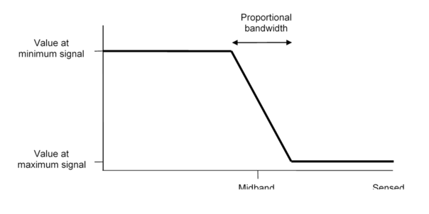 The proportional bandwidth is the width of the band used for proportional control - that is, the movement in the sensed variable between the values that generate the maximum and minimum control signals. This proportional bandwidth is centered about the midband.