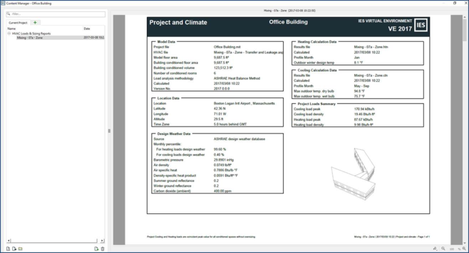 This is presented as a single page report for each file selected. It details model, location, weather and calculation data as well as giving a building loads summary. Further details can be found in Section 5.1 .