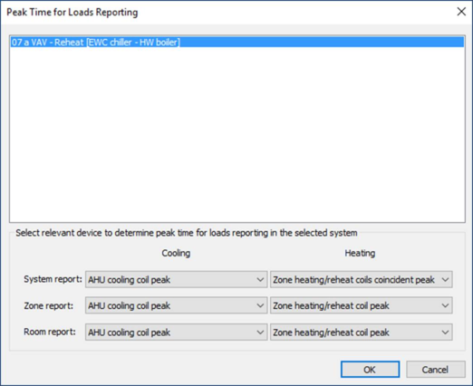 This applies to the System, Zone and Room loads reports and allows the user to set the appropriate peaking devices (and thus peak time) for use in the cooling and heating coil peak frames of these reports. The dialog is launched by selecting the “Peak time for loads reporting…” button.