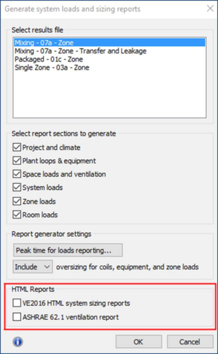 The Generate system loads and sizing report dialog gives access to the VE2016 HTML based sizing reports and the ASHRAE 62.1 ventilation reports. These are not included by default.