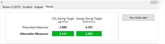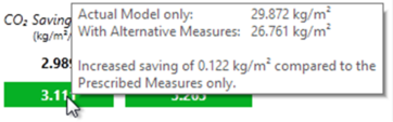 The Results tab will display the target annual savings values for both CO2 and Energy – the savings for the Prescribed Measures (as seen in the original source project) will be displayed first, followed by the savings for the current scenario. If the savings for the scenario are equivalent to or greater than that for the Prescribed Measures, they will be displayed on a green background – otherwise, they will display on a red background. Note that you can hover over the values with the mouse cursor to see the comparative values of the prescribed measures and the alternative measures: