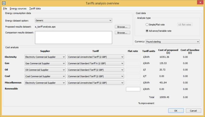 This will provide full access to the Tariff Analysis. The user can create tariffs and combine them to create a realistic scenario of the total cost of running the building. This option also allows the user to incorporate flat rates in combination with the tariffs created. Renewables can only be sold using a flat rate.