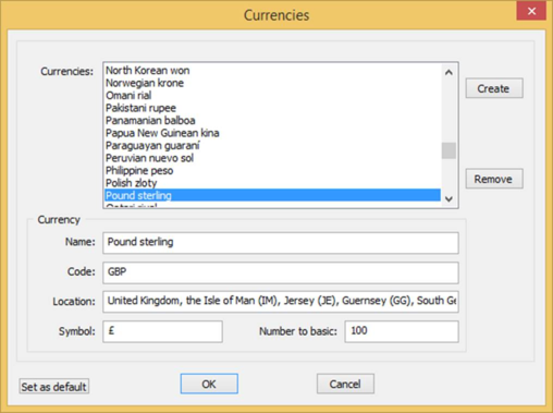 The ‘Set as default’ button will establish current currencies to be default for new projects.