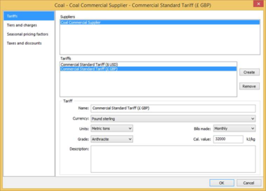 Suppliers and their tariffs are shown in the coal tariffs page. New tariffs can be created for the selected supplier and modified when necessary. For those suppliers located in the United States, short tons will be suggested for the units. However, any can be selected at a later time.