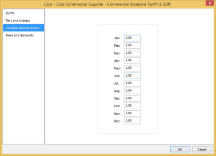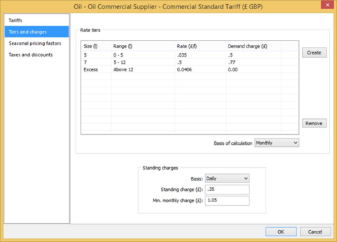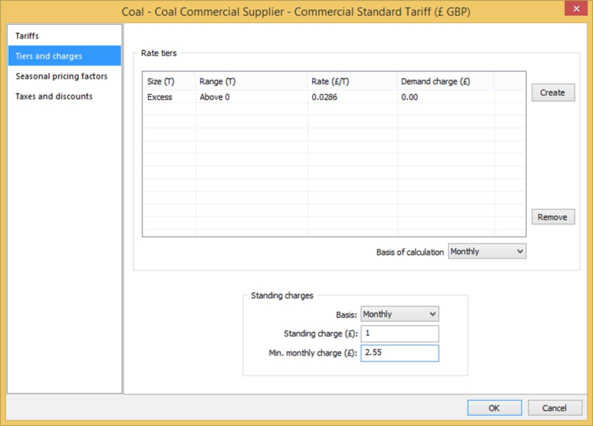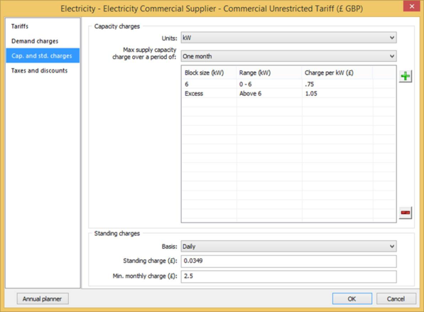 Both standing and capacity charges, with any number of tiers, can be created in this page, available only for tariffs whose type is seasonal time of day or maximum demand.