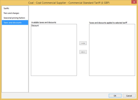 Applicable taxes and discounts to coal tariffs will be listed on the left. Those applied to the selected tariff will on the right.