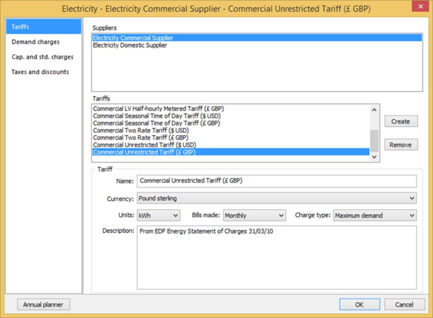 Suppliers and their tariffs are shown in the electricity tariffs page. New tariffs can be created for the selected supplier and modified when necessary.