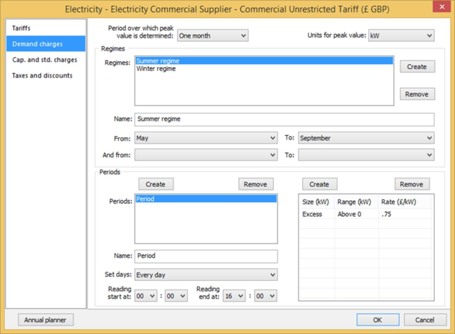 - Maximum demand : under this option, regimes and charges pages will be enabled. Demand charges defined in the charges page are added to the seasonal time of day computing.