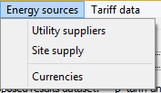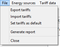 Three menus are available: ‘File’, ‘Energy sources’ and ‘Tariff data’.