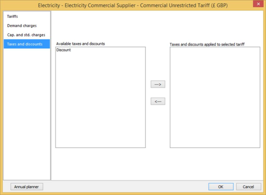 Applicable taxes and discounts to electricity tariffs will be listed on the left. Those applied to the selected tariff will on the right.