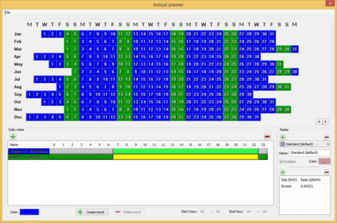 The annual planner can be accessed through the button with the same name in the electricity main window and allows to configure the way the energy demand cost will be computed.