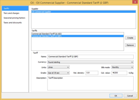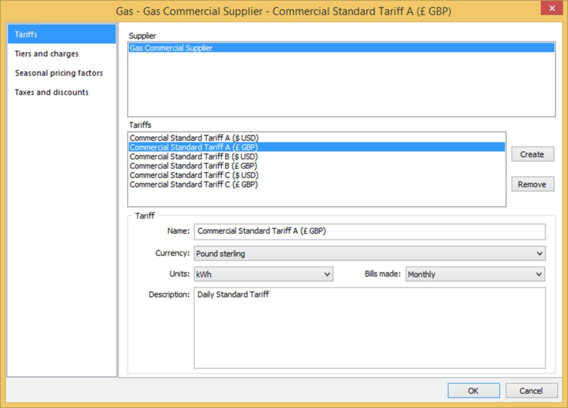 Suppliers and their tariffs are shown in the gas tariffs page. New tariffs can be created for the selected supplier and modified when necessary. For those suppliers located in the United States, therms will be suggested for the units. However, any can be selected at a later time.