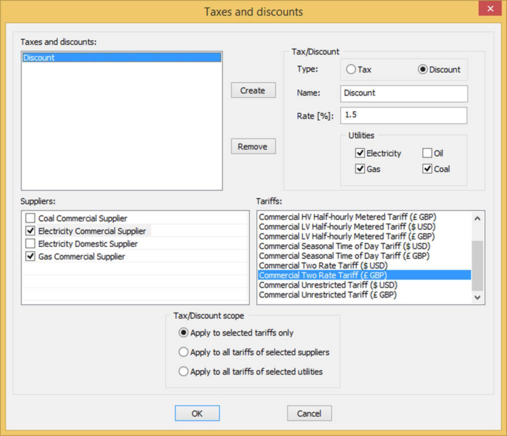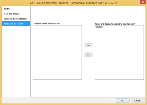 Applicable taxes and discounts to gas tariffs will be listed on the left. Those applied to the selected tariff will on the right.