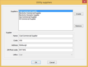 This window allows the user to manage the suppliers for any utility and at least one supplier is needed in order to create tariffs.