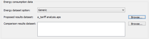 - ‘Comparison results dataset’ allows the user to compare two aps files with the same tariffs. The ‘Browse…’ button opens the same vista folder of the project in use.