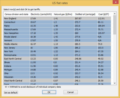 This window has the rates for all of the utilities by state (light blue rows) and census division (light grey). Rates belonging to a state can be updated and the new average rate will be shown in the census division that state belongs to.