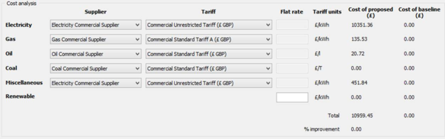 ‘Cost of proposed’ shows the total cost and individual cost for each utility of running the proposed building based on the tariffs selected.