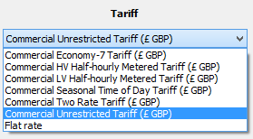 This column shows drop down lists containing the tariffs created and assigned to the selected supplier having the chosen currency. A flat rate option is always available for any utility and supplier.