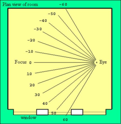 We normally give the CIE Glare Index and the GUTH Visual Comfort Probability (% of people who are satisfied) as measures of glare. These values are calculated at fixed angles to the left and right of the centre of focus (usually at 10 degree intervals from –60 to +60 degrees), see figure below.