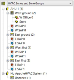 An HVAC zone named ‘Unzoned’ is created automatically in the zone group ‘No ApacheHVAC System’. This serves as a repository for any rooms which have not yet been assigned to other HVAC zones.