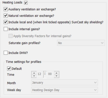 The time, day and month of the heating loads calculation can be chosen. Ensure that the time chosen matches a heated period in the modelled building.