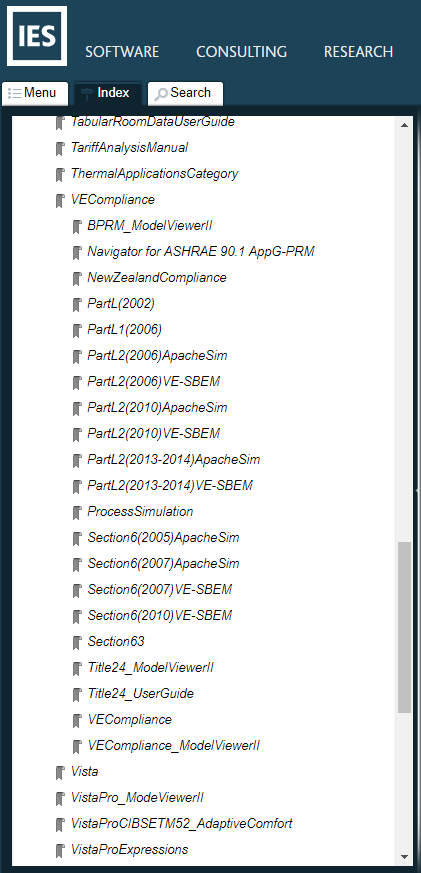 The Index tab gives some commonly accessed terms and keywords to aid users in finding the most commonly used parts of VE or operations most likely to be used when creating models and running analyses using VE. Click on any topic to open the relevant page on the Online Help site.