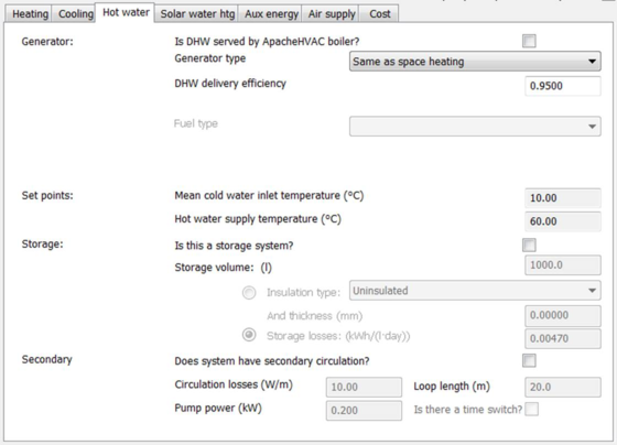 Data on this tab allows you to describe the characteristics of the domestic hot water heating system associated with the Apache System. These properties are used in UK Building Regulations compliance tests and ApacheSim. Domestic Hot Water (DHW) calculations feature optionally in ASHRAE Loads and CIBSE Loads calculations.