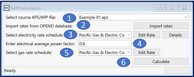 This tariff follows a six-step process in which the user can select a result file, then select/edit the rate structure and run the calculation. Figure 3 shows each of these steps in the tariff tool. Furthermore, steps 2, 3, and 4 are associated with electrical tariff structure, and step 5 is associated with the gas tariff structure. Each of these six steps is explained in detail below.