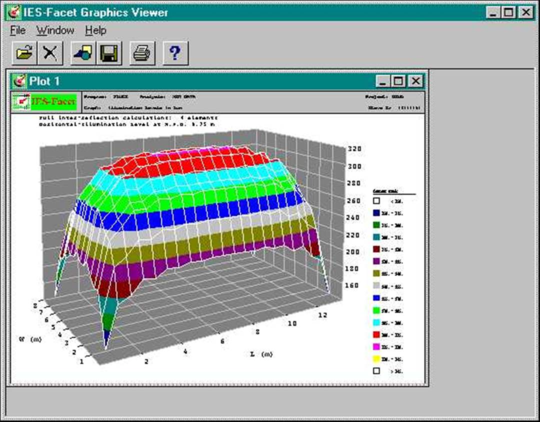 Once the program has finished doing the daylighting calculations, you will be presented with a menu from which you can select: a summary of the results, a table showing the daylight factor levels at the grid points, the option to set the contour levels for the isolux plot and to view the isolux plot.