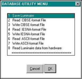 To import or export luminaire and lamp data into or out of the user database, select Database from the top-bar menu, then select Database Import and Export. You may then read or write CIBSE, IESNA or ASCII-format files.