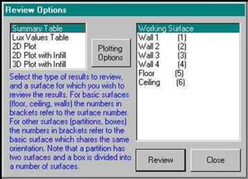 Within the analysis calculations, output can be created from the Calculations Review/Output menu which appears after the calculations have been performed. For all calculations you can select a table showing the illumination levels at grid points on the working plane, or isolux plots. If you select an isolux plot you will be asked what size paper you wish the plot to be scaled to.