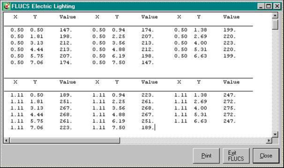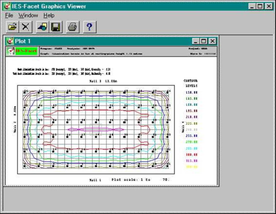 Once the program has finished doing the electric-lighting calculations, you will be presented with a menu from which you can select: a summary of the results, a table showing the illumination levels at the grid points, the option to set the contour levels for the isolux plot and to view the isolux plot.