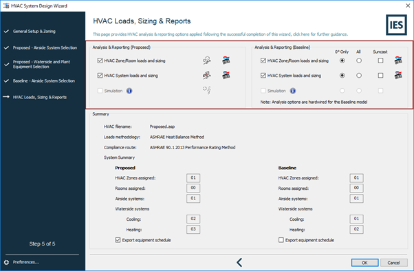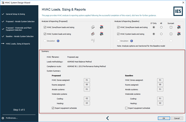 Finally, a summary is presented which shows various information pertaining to the HVAC systems and their assignment. In addition, an equipment schedule can be exported to the project directory. This is an excel document that lists the various pieces of equipment and their sizes.