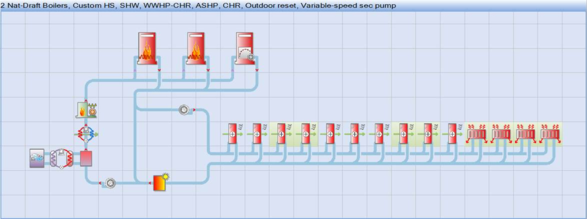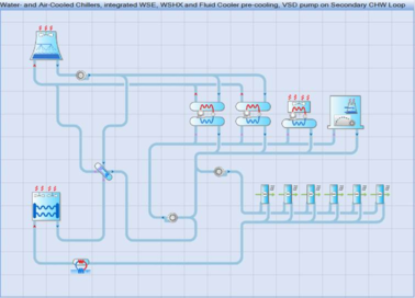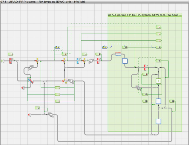 Figure 1 - 1 : The initial model workspace or canvas displays the HVAC system airside schematic and provides a graphical means of selecting, configuring, organizing, and editing airside component and controller objects. While plant equipment other than that associated with water loops is accessed while remaining in this view, this is what we refer to as the airside HVAC or airside network view.