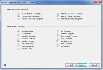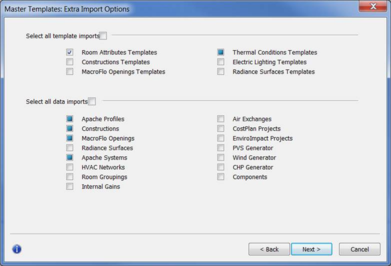 · Templates: this allows the user to import entire template datasets for each of the given template types. For example selecting “Thermal Conditions” templates shall import ALL thermal conditions templates from the source master template.
