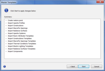 Note: The first items on all jobs shall be “Create restore point”. Whenever we apply a master template job, we create a restore point prior to applying changes. At any point, the user may revert the application of a master template by choosing the “Master Templates Restore” menu item option. All restore points shall be displayed allowing the user to restore back to the previous model state.