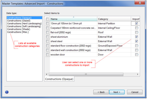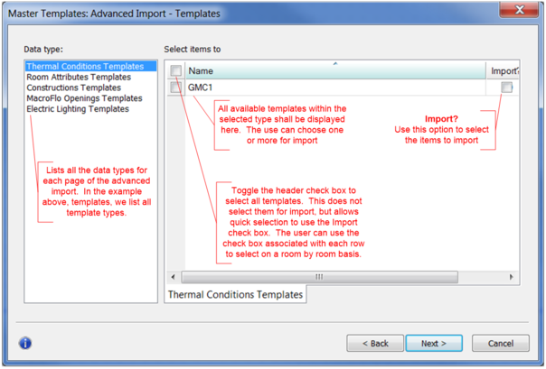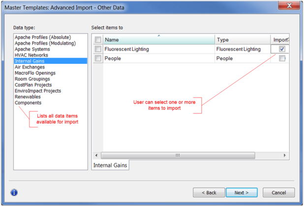 Selecting from the data type list shall update the displayed options on the right hand side. The image above shows that we have selected to import internal gains and thus, the data displayed is that of the master template internal gains list, where we can choose one or more items to import.