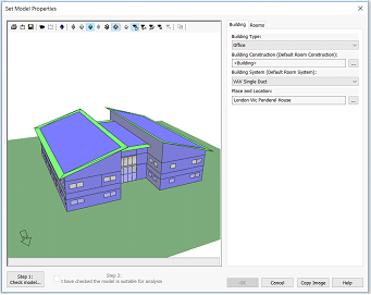 This option takes the user through the VE ‘Set Model Properties’ dialogue, which is a simplified quick method of applying ASHRAE (The American Society of Heating, Refrigerating and Air Conditioning Engineers) template data on import to the VE.