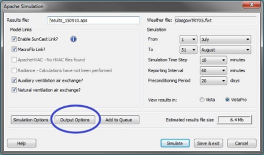Before you are able to import the boundary conditions, you have to make sure the Apache Simulation is setup correctly to export the boundary conditions. This can be done easily in the ApacheSim dialogue box. Before you run Apache Sim, open the output options.