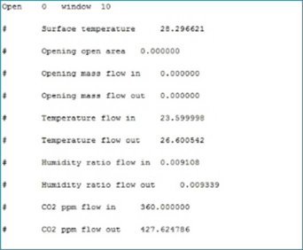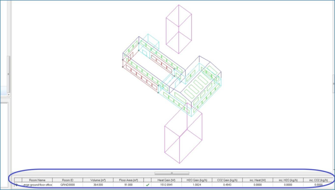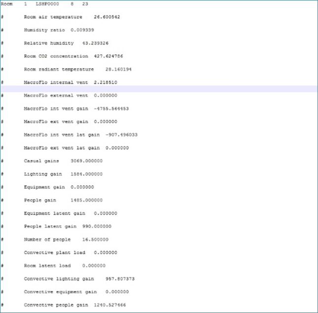 This lists out the results for the room. This is the basis of the data imported into MicroFlo simulation. A particular point of interest is the ‘Convective Plant Load’. In case you have imported your results from the results of the ApacheSim where the room has a set point, ‘Convective plant Load’ will be the heating and cooling that will have to be applied to the CFD model to achieve the same average temperature results as the ‘Room Air Temperature’ noted here.