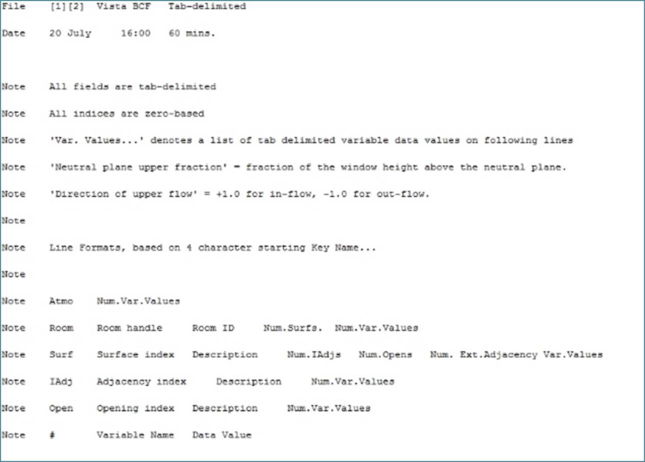 This is just the header section which details out how the information has been listed in the file. At the top it lists the file type which is ‘Vista BCF’. This followed on next line by the instance for which boundary conditions were exported and the duration used for averaging of the VistaPro results for the export.