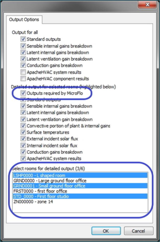 In this dialogue, make sure you have selected the ‘Outputs required by MicroFlo’ option. In the list at the bottom, ensure that you have selected all the rooms that you want the boundary conditions exported for after running the Apache Simulation. You can select multiple rooms by holding Ctrl and clicking on various rooms in the list. Please note that boundary conditions will NOT be exported for the rooms which are not selected in the list. Click OK to close this dialogue box after you have set everything as per requirements and/or choice. Run the ApacheSim now.