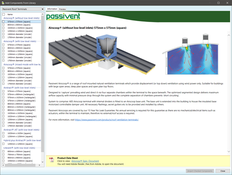 The units are represented in the VE by components – when placed into a room, the room will automatically be updated to make use of the Passivent Roof Terminals unit and associated data. You can import the units by clicking on the Import the Passivent products from library item in the Navigator – this will open the Add Components From Library window with the Passivent Roof Terminals: