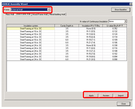 Improved baseline constructions for use in the proposed building can be imported into the ApCdb construction data base manager once manual edits have been made. Note that a copy will be made for the proposed building and the baseline construction itself will not be edited.