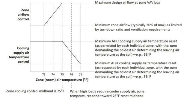 Coordination of zone cooling airflow and cooling supply air temperature (SAT) reset at the system cooling coil according to zone demand provides an instructive example of how and why controls should be sequenced.