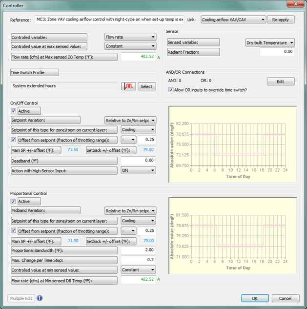 Figure 6-14 and Figure 6-15 first a graph plotting the functions of these controllers with respect to the room temperature and then Figure 6-16 and Figure 6-17 illustrate the controller input dialogs for typical VAV cooling airflow control and SAT reset. To keep the visualization clear, the nighttime setback and fan cycling for unoccupied hours via timed midbands have been omitted from the graph shown here (see the sections on Prototype Systems and System Sizing toward the end of this user guide for more information). The graph shows only how the two controllers would function during occupied hours.