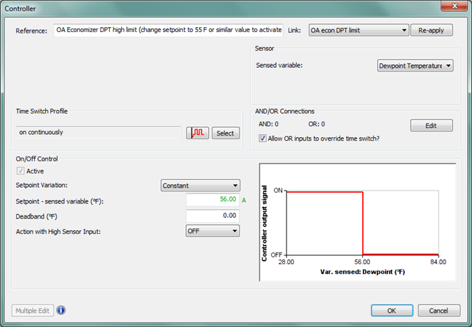 In the example shown in Figure 6-22 , the controller monitors outside dew-point temperature and gives an ON signal when it exceeds 56°F. In this case, there is no deadband, as the control will not influence the outdoor air condition, and thus there will be no possibility of a feedback loop.